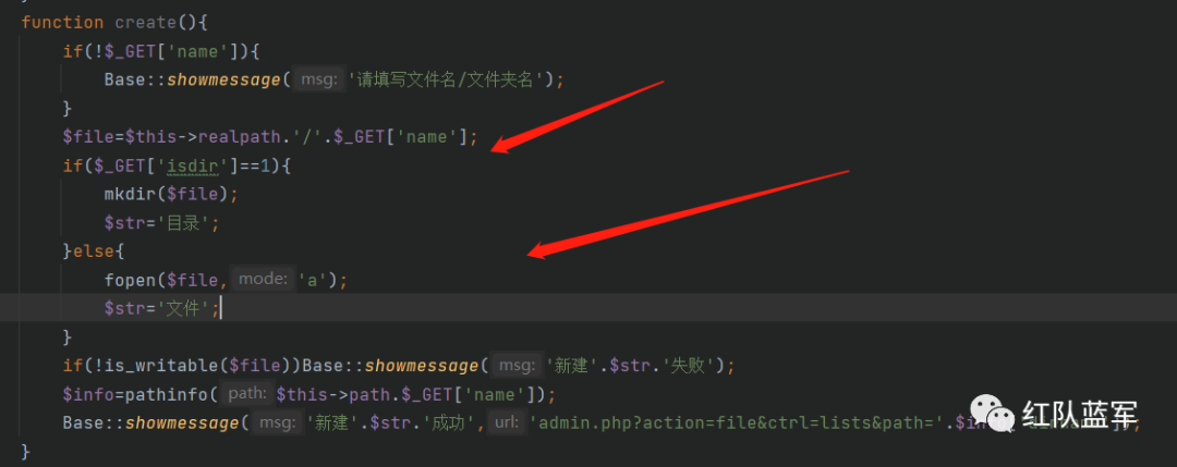 跟进去看一下代码,这里会根据GET到的name来进行判断,再通过参数是否存在isdir来确定是否为 目录是创建目录,不是则创建文件fopen(),且未限制后缀直接get写入。