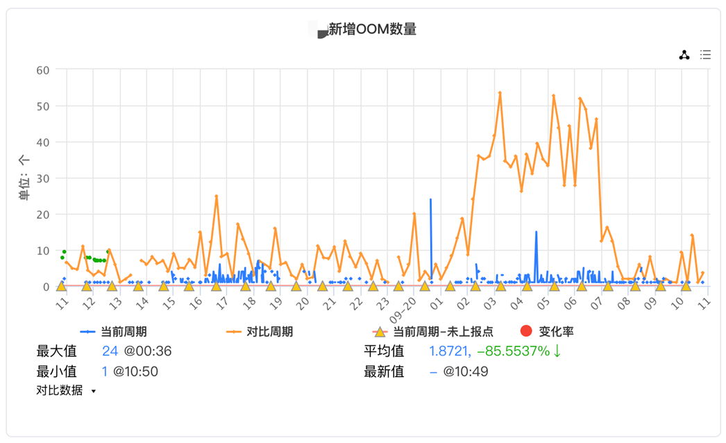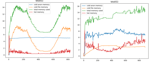 绿色线为总的内存使用量,蓝色线是匿名页的冷内存占比,橙色线是文件页冷内存占比。可见冷内存在集群占比比较高。