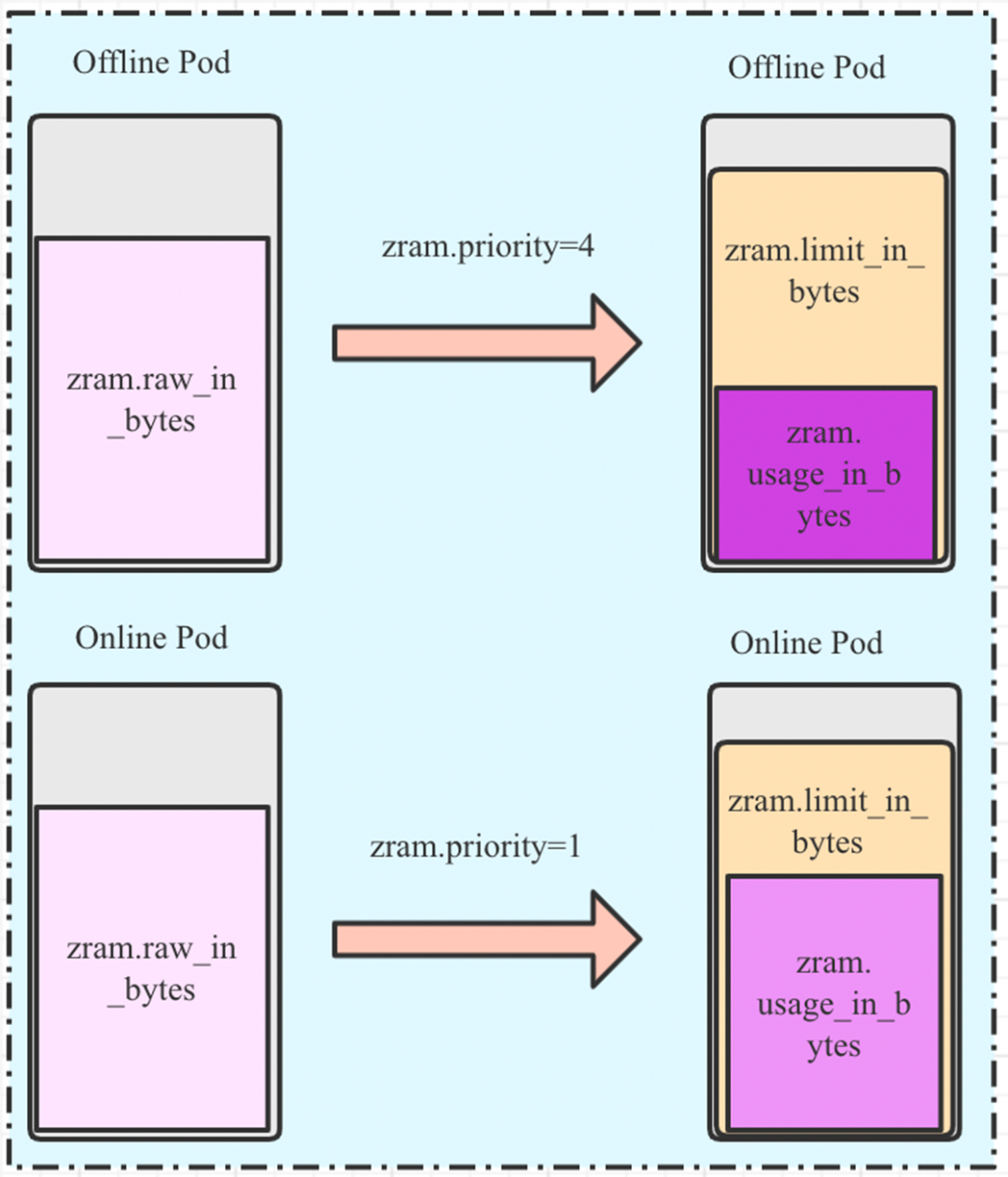 ● zram的页面无法统计,这也是社区面临的问题:目前workload的resources.limits.memory是对cgroup的memory.usage_in_bytes做限制,但是压缩在zram的匿名页面无法被限制,会造成计数器泄露的问题,pod可能无限制得利用node上的zram资源,而k8s感知不到。