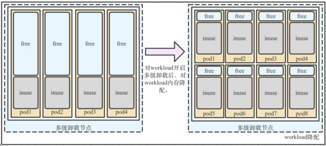 提高内存混部率:把非内存敏感型workload开启内存多级卸载,节省出多余的空闲内存资源,可以调度更多的离线(低优先级)pod上来,并且,在整机内存压力大又不能及时迁出的情况下,优先迁出、OOM调离线(低优先级)pod。