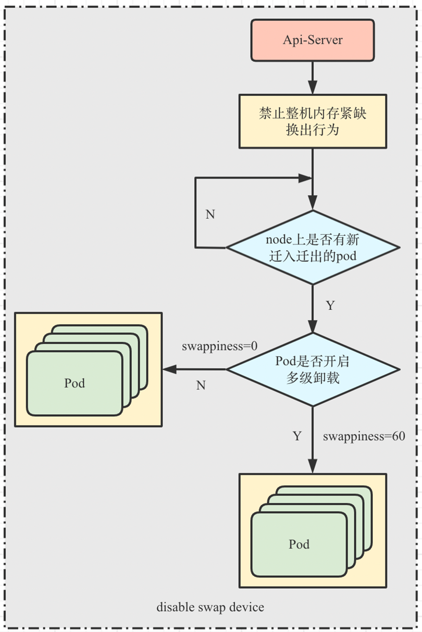 ● qos-agent:qos-agent对开启多级卸载的集群,设置vm.force_swappiness=1,强制在整机、容器内存紧缺的情况下,强制对swappiness==0的容器不回收匿名页面;并且,在node上pod状态发生变化的时候,对非多级卸载pod设置swappiness=0,多级卸载pod设置swappiness=60。