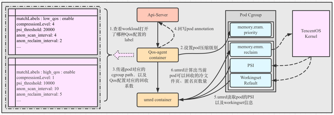 ● qos-agent container:当node上pod状态发生变化的时候,根据pod yaml打的QOS标签,对pod开启多级卸载,并且启用QOS标签对应的压缩等级和回收参数。