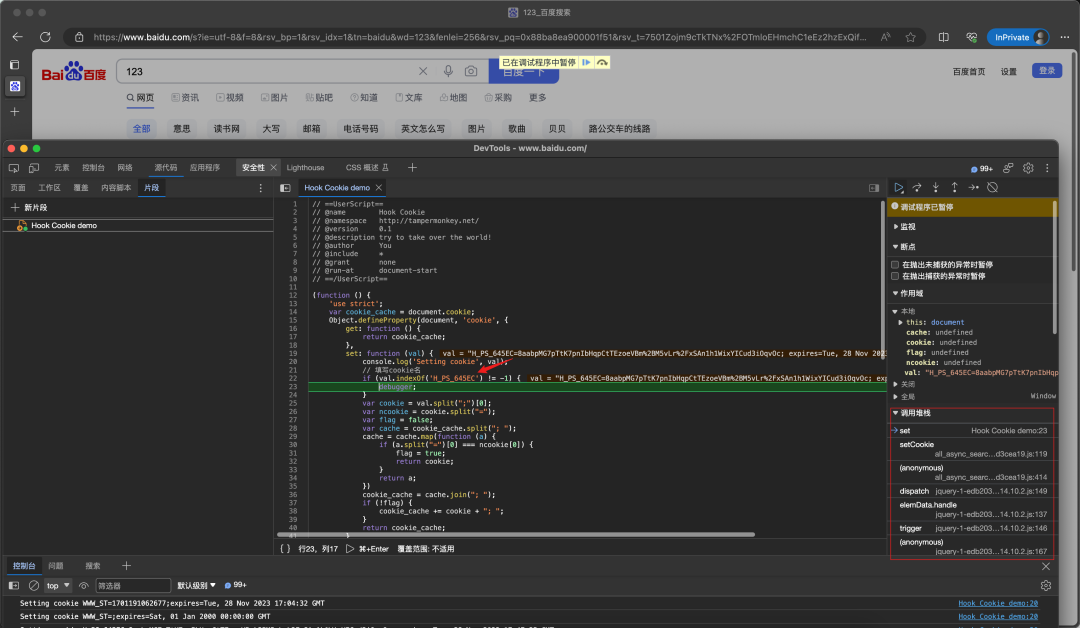 这里我们监控了 Cookie H_PS_645EC的添加,发现添加后就进入 debugger,搜索 123 就生成了该 Cookie