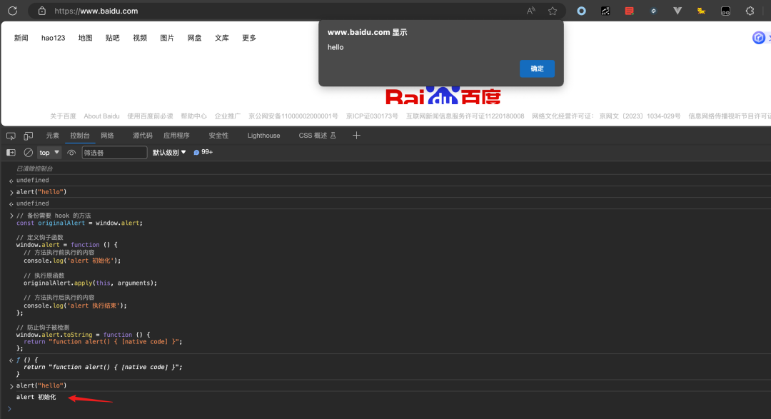 其实本质上就是一种 hook,只不过我们没有对 alert 做额外的操作来改变执行流程而已