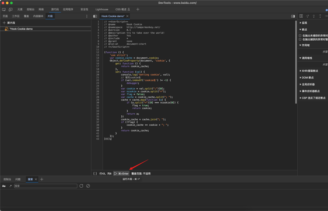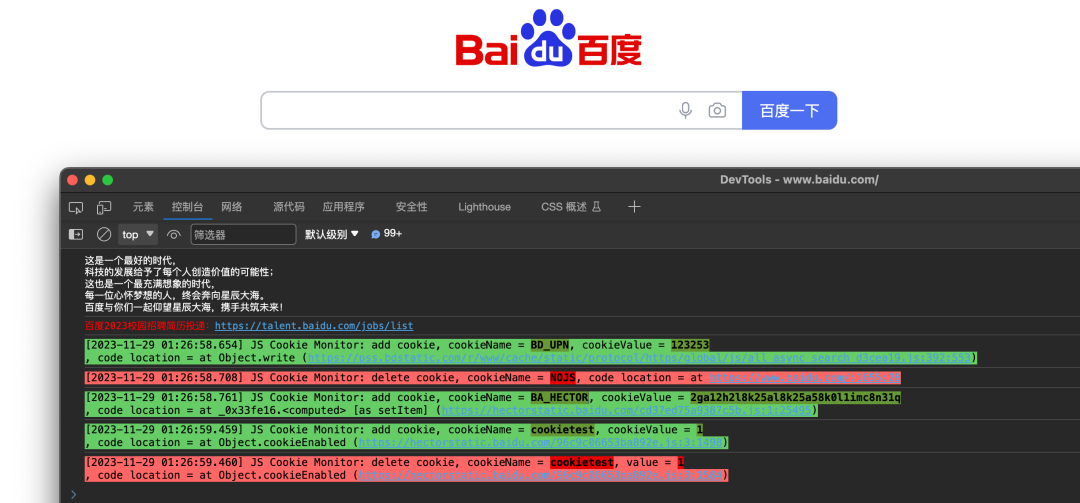 cookie_cache,用于缓存原始的 document.cookie 的值。Object.defineProperty 方法重新定义了 document.cookie属性的 getter 和 setter 方法。cookie_cache 值,即原始的 document.cookie 的值。debugger)。cookie_cache 值。通过以上步骤,这段代码成功地将对 document.cookie 的读取和设置操作进行了拦截和监控。在设置 cookie 值时,会进行特定条件的判断和处理,并更新缓存中的 cookie 值。你可以根据实际需求修改代码中的条件和处理逻辑。