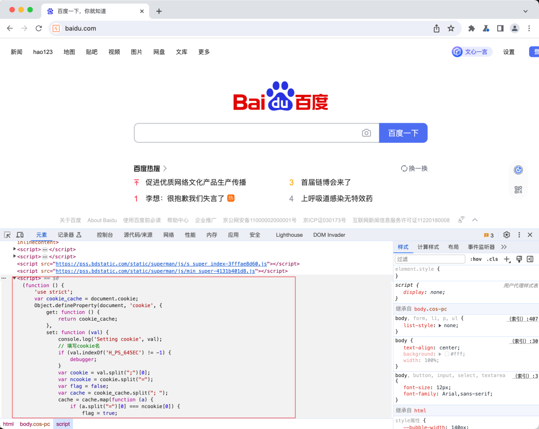 code 的函数,函数内部包含了对 document.cookie 的拦截和监控逻辑。__lookupSetter__ 方法获取原始的 document.cookie 的 setter 函数,并将它保存在变量 org 中。__defineSetter__ 方法重新定义了 document.cookie 的 setter 函数。在新定义的 setter 函数中,如果设置的 cookie 值中包含特定的字符串("TSdc75a61a"),则会触发一个断点调试器(debugger)。__defineGetter__ 方法重新定义了 document.cookie 的getter 函数,使其返回变量 org 的值,即原始的 document.cookie 的值。<script> 元素,并将其内容设置为调用 code 函数的代码字符串,通过在代码字符串外添加括号和调用操作符 () 来立即执行该函数。<script> 元素添加到当前文档的 <head> 元素或根元素中。<script> 元素。通过以上步骤,这段代码成功地将对 document.cookie 的读取和设置操作进行了拦截和监控。如果设置的 cookie 值中包含字符串"TSdc75a61a",则会触发一个断点调试器,允许开发者在浏览器的调试工具中进行进一步的调试和处理。