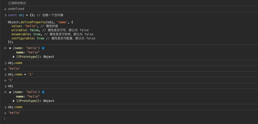 const obj = {}; // 创建一个空对象Object.defineProperty(obj, 'name', {