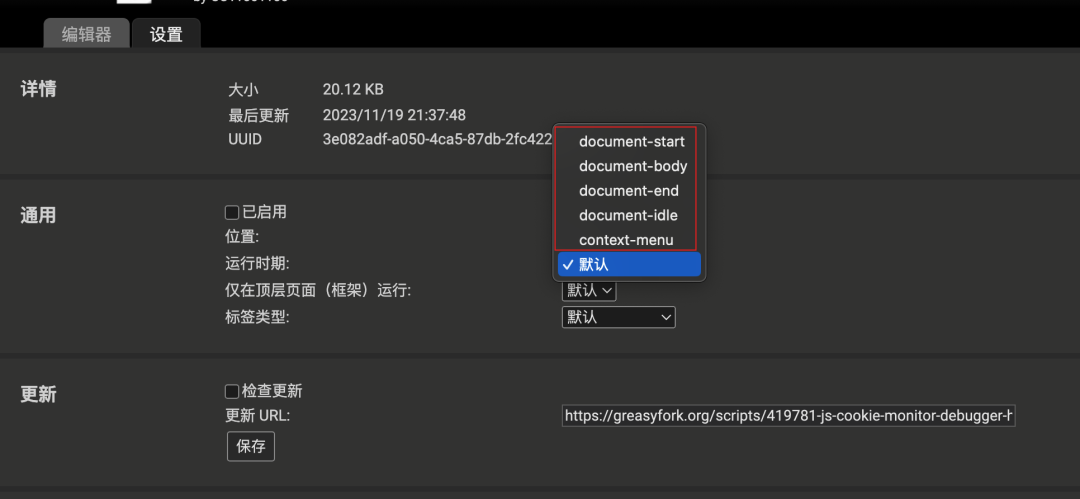 油猴脚本默认情况下存在 @run-at 配置项,可以指定 hook 的时机