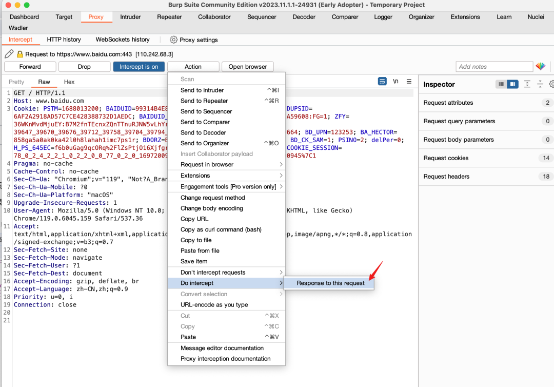 我们最常用的 burpsuite ,直接抓页面返回包,之后将 hook 代码添加进去
