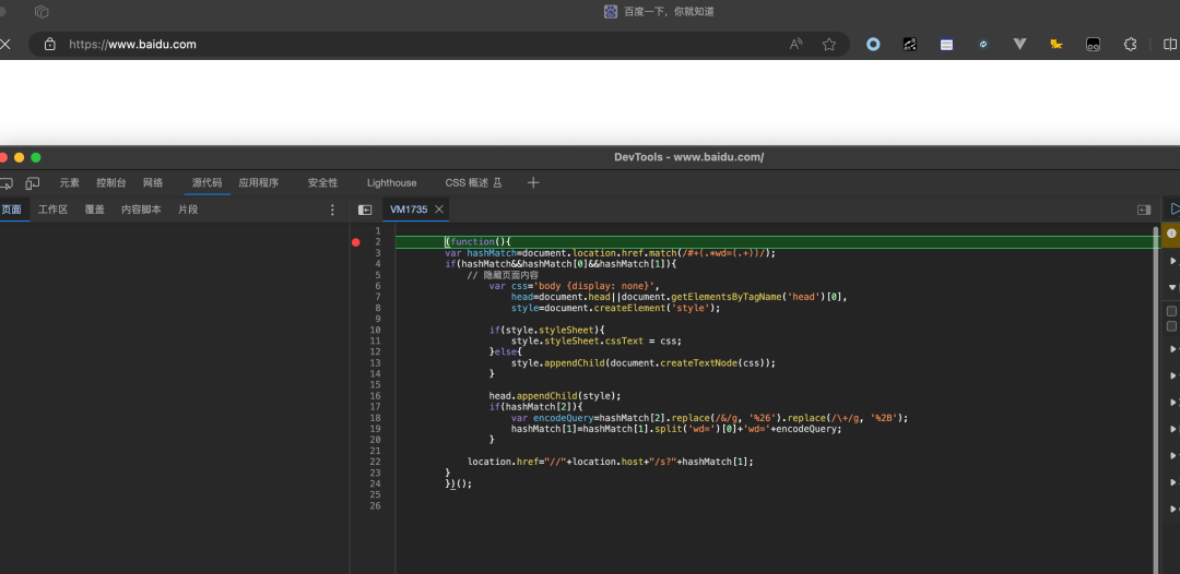 // 如果 URL 中包含特定字符串("MmEwMD"),则触发断点调试器