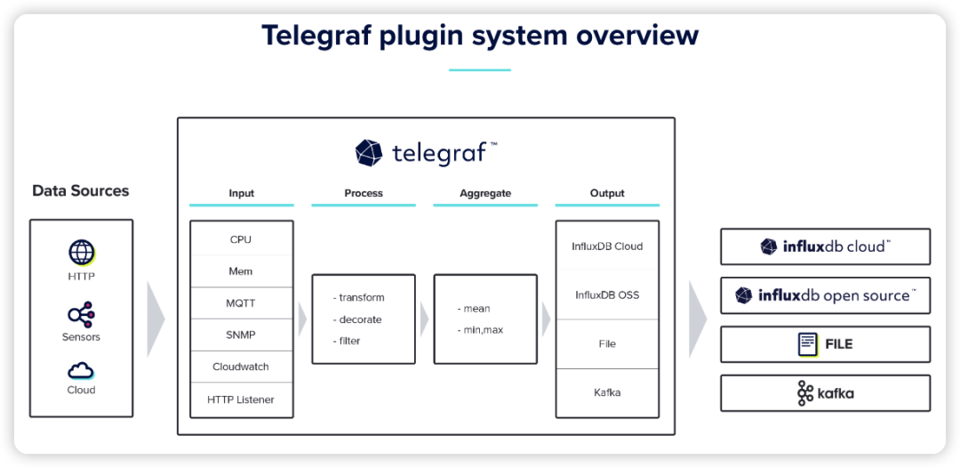 官方提供了大量可选的插件,另外Telegraf是易于拓展的,如果官方的插件无法满足你的需求,你可以在Telegraf的基础上写出自己的插件。