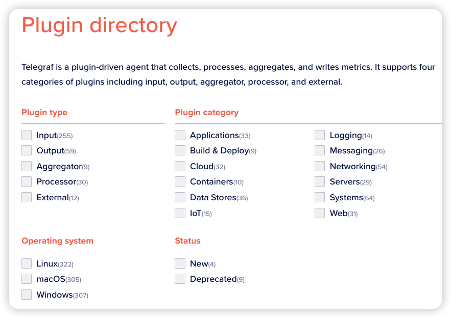 Telegraf官网有一个插件目录,可以进行快速的查看检索