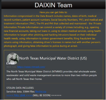 来源:https://securityaffairs.com/154881/cyber-crime/daixin-team-north-texas-municipal-water-district.html?web_view=true