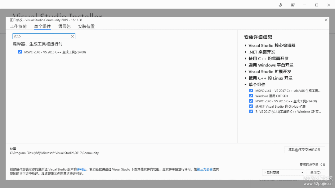 我们运⾏VS的visual studio installer:点击修改 在单个组件⾥⾯搜2015