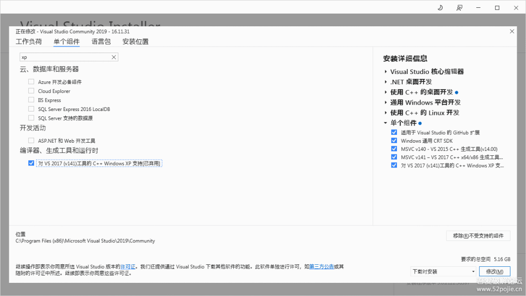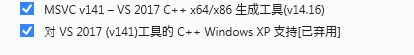 安装的时候我们可以看到组件⾥⾯只有:vs2015 不带xp环境;我们勾上他