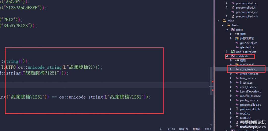 补充一下core_tests.cc这里,如果不是utf-8编码,这里会是乱码,也会导致报错