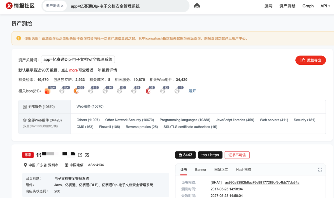 https://x.threatbook.com/v5/survey?q=app%3D亿赛通Dlp-电子文档安全管理系统