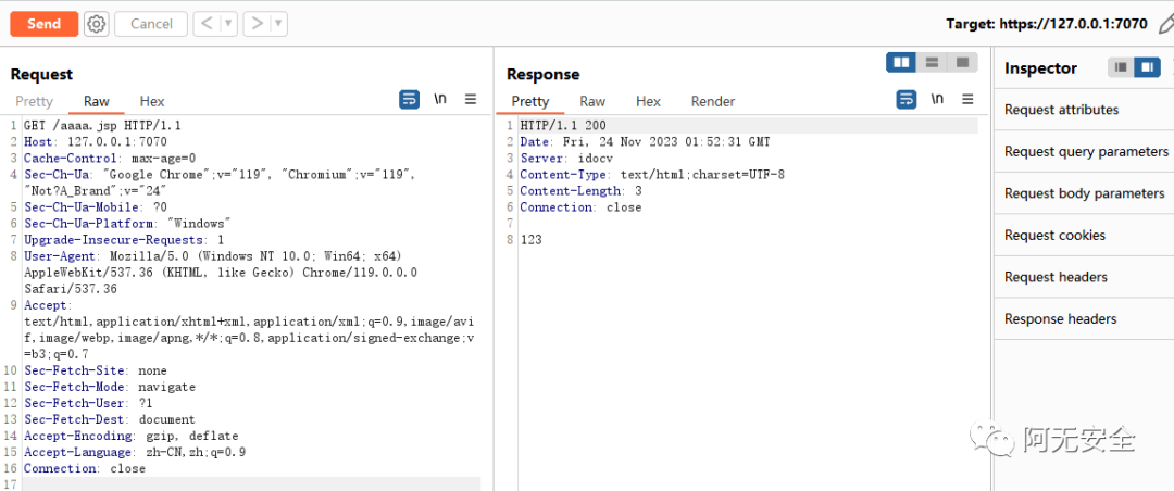 GET /aaaa.jsp HTTP/1.1Host: 127.0.0.1:7070Cache-Control: max-age=0Sec-Ch-Ua: "Google Chrome";v="119", "Chromium";v="119", "Not?A_Brand";v="24"Sec-Ch-Ua-Mobile: ?0Sec-Ch-Ua-Platform: "Windows"Upgrade-Insecure-Requests: 1User-Agent: Mozilla/5.0 (Windows NT 10.0; Win64; x64) AppleWebKit/537.36 (KHTML, like Gecko) Chrome/119.0.0.0 Safari/537.36Accept: text/html,application/xhtml+xml,application/xml;q=0.9,image/avif,image/webp,image/apng,*/*;q=0.8,application/signed-exchange;v=b3;q=0.7Sec-Fetch-Site: noneSec-Fetch-Mode: navigateSec-Fetch-User: ?1Sec-Fetch-Dest: documentAccept-Encoding: gzip, deflateAccept-Language: zh-CN,zh;q=0.9Connection: close