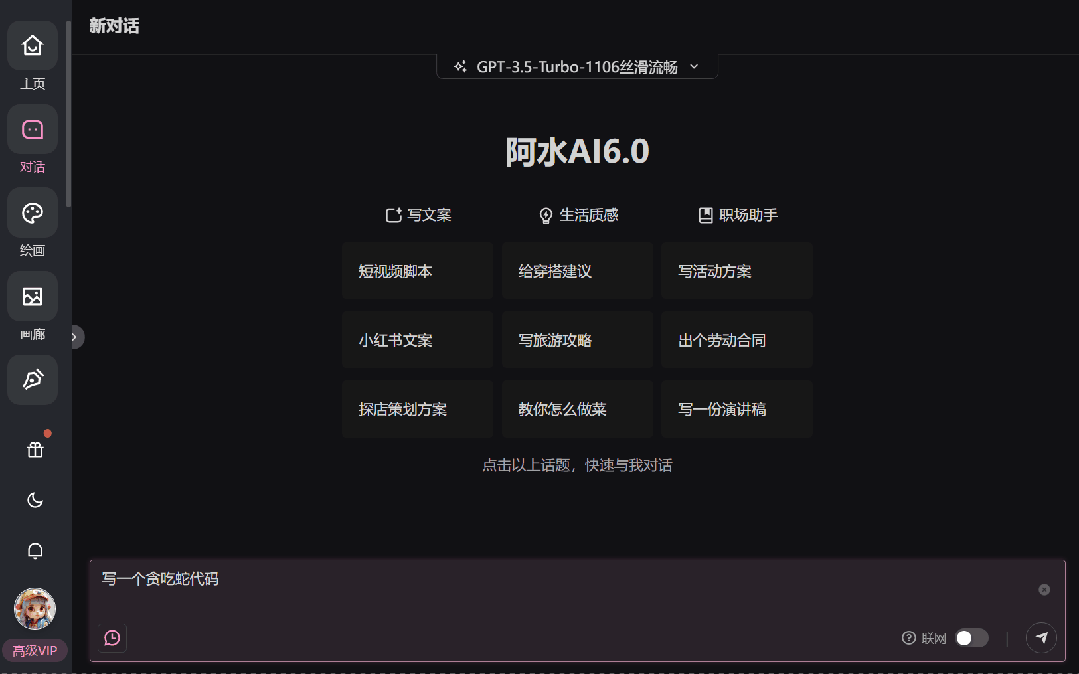 ✔ 在线使用地址:https://ai.xiabb.chat/从半年前ChatGPT上线开始,阿水AI便持续跟进,陆续接入了国内外多家大模型,迄今为止已经完美接入:用户们可在各个模型之间自由切换使用,不受任何限制!因为我们始终坚信:给用户选择的权利,是最好的选择!▼阿水AI使用地址:https://ai.xiabb.chat/GPT3.5主打一个速度快,超高速响应,体验感好,用于解决日常工作的轻量需求毫无压力。