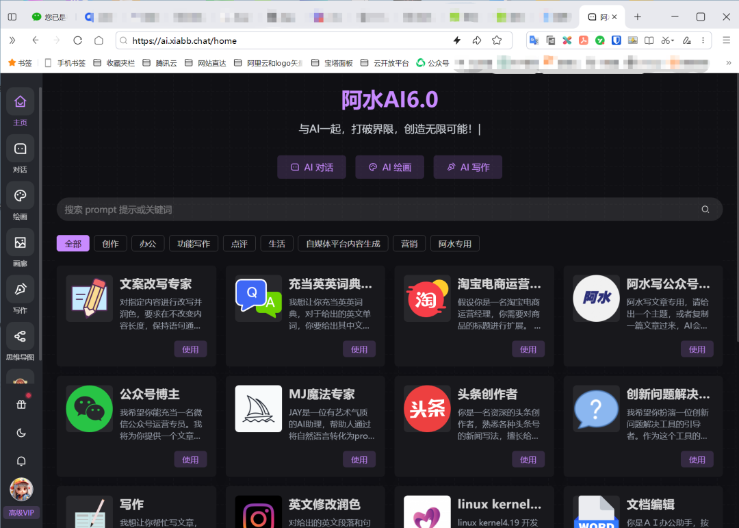 https://www.123pan.com/s/69CRVv-pZOWd.htmlhttps://feixue.lanzouj.com/b0ehtb57e 考虑到很多朋友的多端办公需求,阿水AI可支持最多三台设备同时登录!你可以手机、电脑、平板同时登录!聊天记录支持云端实时同步,以后不仅可以在电脑上办公,回到家用手机也可以处理工作![]() 为了方便大家在更多场景的应用,我们还基于AI制作了很多特色功能。比如“一键写作”,根据你的需求,一键生成不同长度/格式/语气/语言的文章。既然GPT4.0和MJ 官方定价昂贵,且国内使用不方便,所以阿水AI团队希望尽最大努力和诚意,来打破这一尴尬的价格。