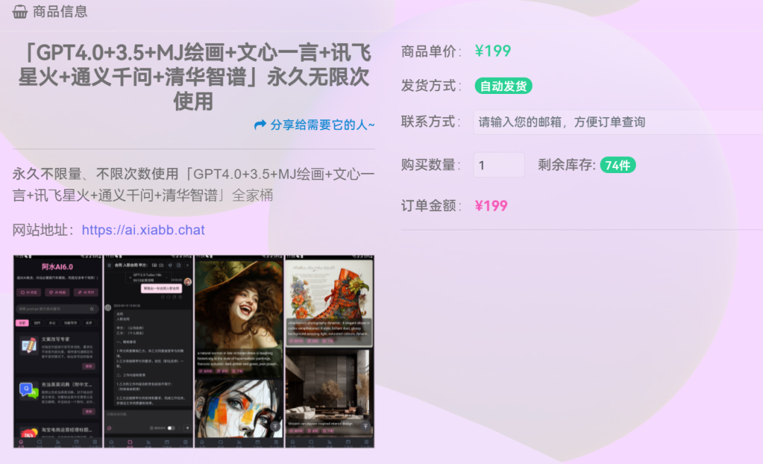 「包含权益」:无限次使用GPT4.0+3.5+MJ绘画+文心一言+讯飞星火+阿里通义千问+清华智谱所有大模型!你没看错,在阿水AI只需199,便可不限次数使用以上所有AI大模型,后续上线PPT一键生成/语音对话等功能,也一律免费!199即可入手「GPT4.0+3.5+MJ绘画+大模型全家桶」不限次使用,我相信对比过官方的朋友,都知道我们的定价多良心。以前我们售了一段时间的永久卡,后面发现这种模式成本确实太高。为了项目的可持续性发展,我们决定:今晚十二点过后不再售卖永久卡,改成年卡!