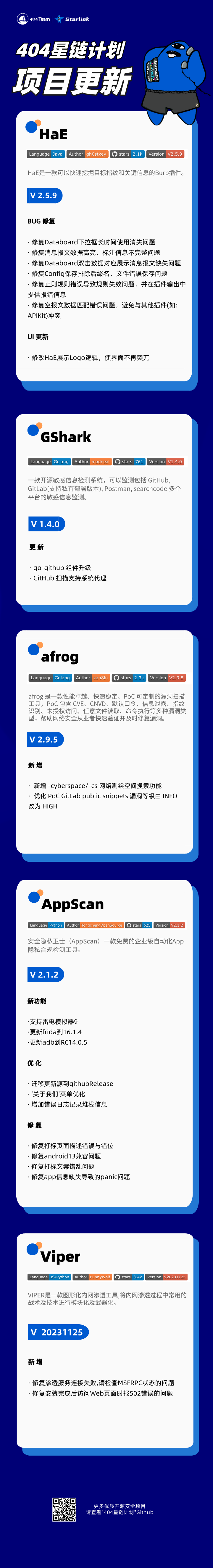想要学习和交流开源安全工具的朋友可以加入404星链计划社群,请扫码识别运营菜菜子微信二维码,添加时备注“星链计划”。