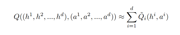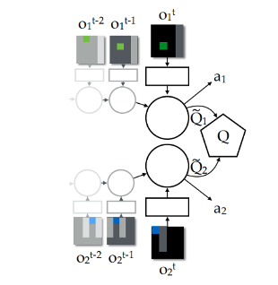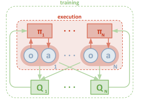 然后通过总的损失函数进行反向传播即可训练出各个智能体的局部Q网络,而无需为单个智能体设计奖励。可以看出,不同于COMA,VDN是直接为每个智能体学习到了一个局部的Q网络,该局部Q网络可直接用于离散任务中的分布式决策。我们很容易想到,可以将VDN的思想应用在actor-critic框架下,实现连续任务的控制,MAAC就用到了这样的框架。