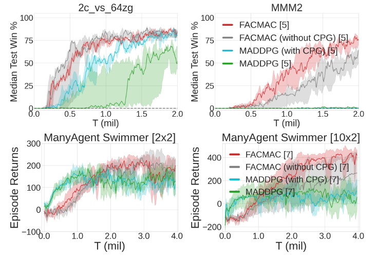 如图6所示,作者进行了消融实验来证明集中式策略梯度的优势,带有CPG的算法代表使用了集中式策略梯度的方法。作者在不同的环境任务下对比了具备和不具备集中式策略梯度方法的FACMAC与MADDPG,实验结果证明,集中式策略梯度算法相比于传统的策略更新,性能上有所提升。