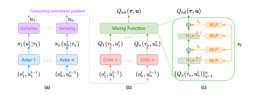 如图3所示,所有智能体一起使用一个集中式的critic,且critic的值可被分解为