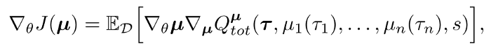 在FACMAC中,为了对各个智能体的策略进行更新,一种比较直接的方式是类似于MADDPG,利用集中式的critic或值分解之后的局部critic计算单个智能体策略的梯度,但会导致策略进入次优解。因此,作者提出对整个联合动作空间进行集中式更新,也就是说在估计Q值时,根据所有智能体当前的策略采样动作,此时集中式的策略梯度可以计算为