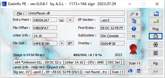 换用某厂加了 VMP 壳的 UnityPlayer 进行测试,一样成功检测,并且 ExeinfoPe 没有检测到 VMP 的存在 (已使用 ExeinfoPe 最新版本)