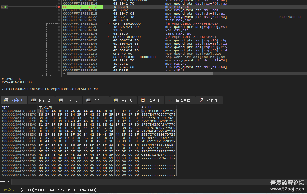 复制代码 隐藏代码.text:00007FF74DE06E18 mov r13, rcx