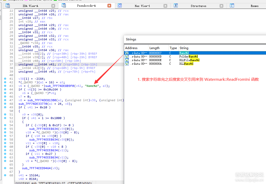 然而在后期测试的时候,BaseFunction::AddWatermark 实际上是被虚拟机保护了,但 Watermark 类并没有被虚拟机保护,其中的 Watermark::ReadFromIni 函数特征及其鲜明,这意味着我们可以通过 dump 下来的程序,抓住函数地址并直接读取水印内容,见下文