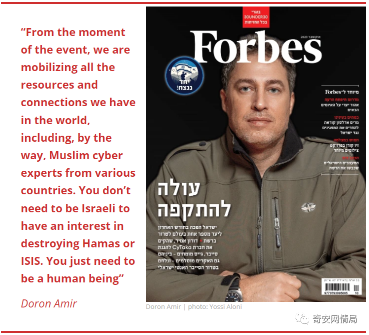 现在,多伦·阿米尔正在“合法且不违反规则”的情况下利用他的网络能力进行战争,他热衷于澄清这一点。他称, “我们不是以以色列网络情报公司NSO集团,我们没有间谍软件,但有足够多的自由黑客团体明白恐怖不仅是不道德和无情的,而且与宗教和国籍无关。”