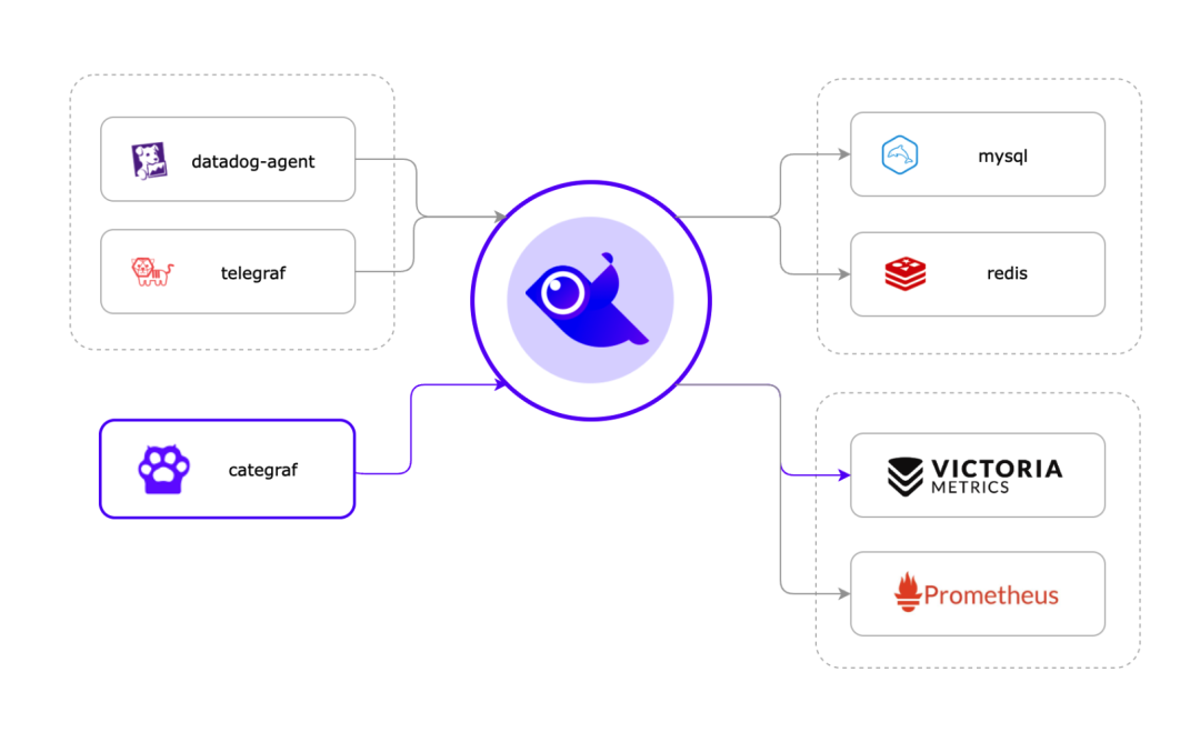 当然,也可以使用其他采集器,比如 telegraf、grafana-agent 等,但是 categraf 的对接最为丝滑。夜莺支持多种数据接入协议,比如 prometheus remote write、OpenTSDB、Datadog 等,接收到数据之后做统一转换,然后转发给后端时序库,具体转发给哪些时序库可以在夜莺的配置文件中配置。