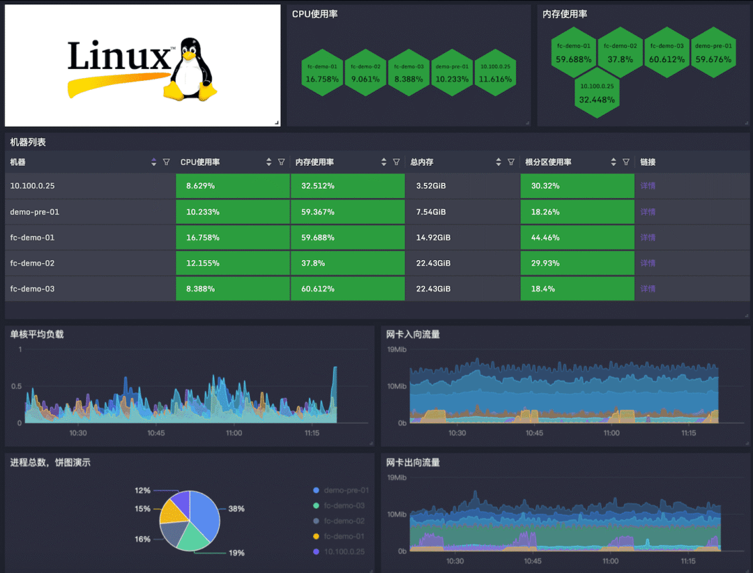 夜莺的仪表盘展示效果美观、性能出众、功能丰富,虽然还没有 Grafana 的全面,但基本可以作为 Grafana 的国产化平替了。夜莺的仪表盘支持暗黑主题,效果如下: