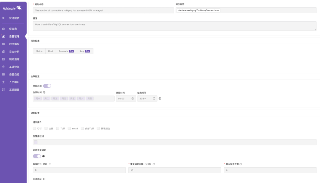 灵活的告警是优秀监控系统的标配,夜莺在这方面十分全面。它可以用一套规则生效到多个数据源,支持级别抑制、生效时间、告警屏蔽、告警订阅、告警自愈等规则。