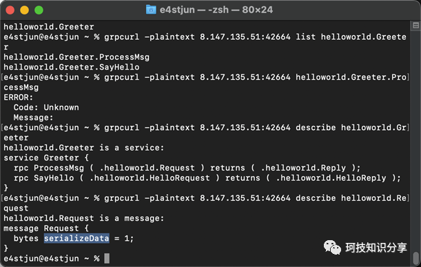 grpcurl -d '{"name":"test"}' -plaintext 8.147.135.51:42664 helloworld.Greeter.SayHello调ProcessMsg这个反序列化接口,理论上来说bytes写json需要{"serializeData":[49, 49]}这样写,但其实base64就行了。