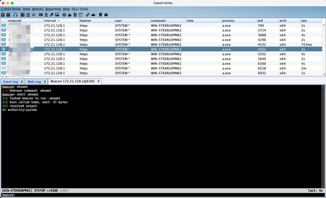 kubectl apply -f CVE-2023-3676.yaml由于 subPath 不正确 pod 创建失败,但是命令成功执行,成功上线并且权限也是管理员nt authority\system,而且由于 pod 创建失败会一直创建不停上线,后续还需优化。