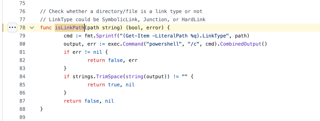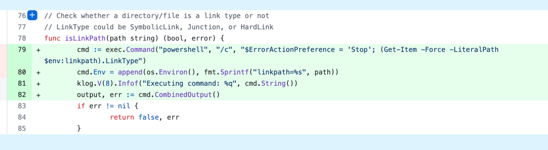 该函数主要讲subPath作为参数确实是否为符号链接,然后创建一个PS命令,并通过exec.Command之间调用,而在这里并未做其他校验直接进行了命令调用,存在命令注入的可能。
