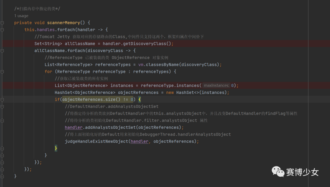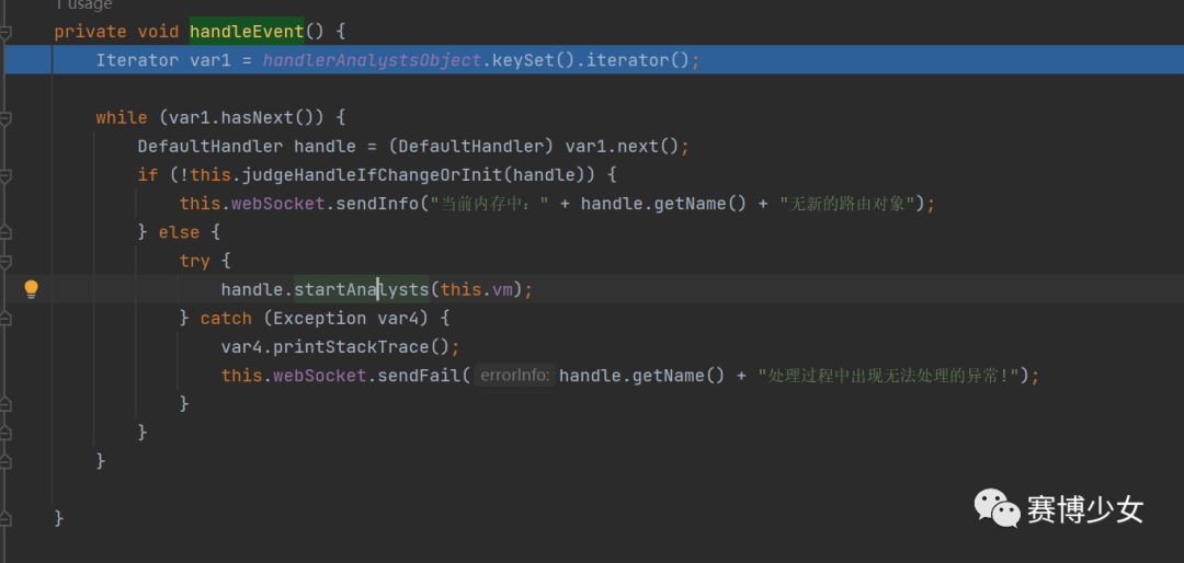 com.kyodream.debugger.core.thread.DebuggerThread#handleEvent,真正处理事件,分析内存,首先获取handler也就是中间件,再判断内存是否是初次分析以及有没有改变,然后进入分析逻辑DefaultHandler#startAnalysts,根据中间件不同,进入不同子类