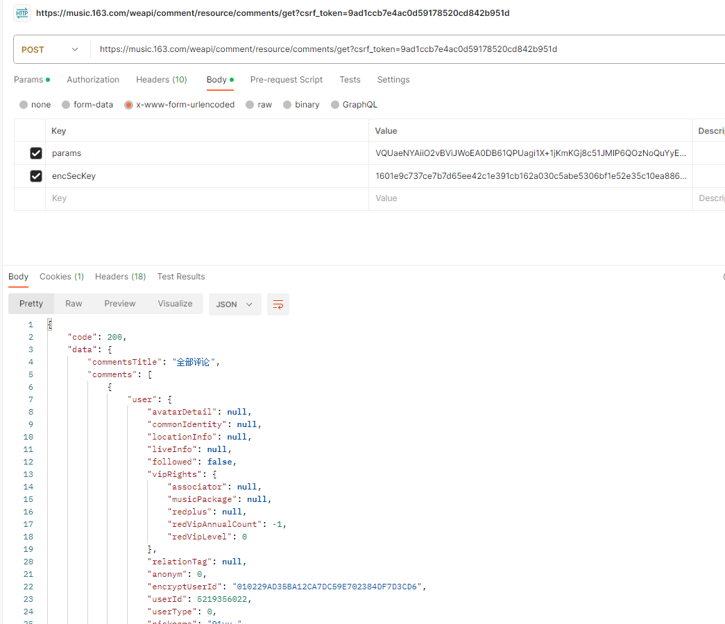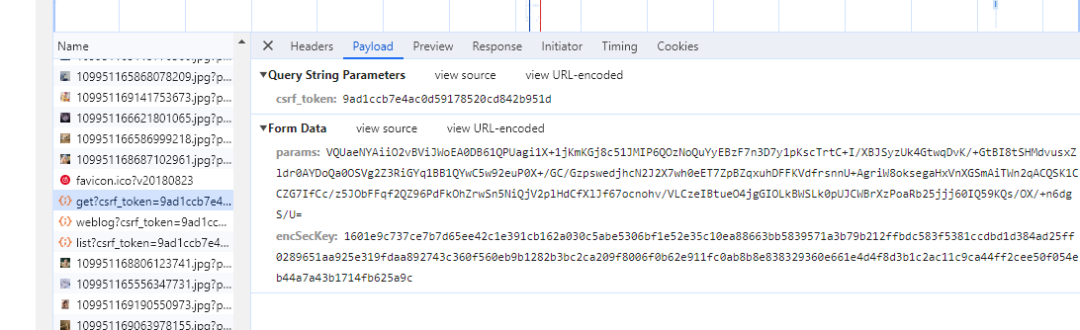 {"rid":"R_SO_4_2102785224","threadId":"R_SO_4_2102785224","pageNo":"2","pageSize":"20","cursor":"1703117062380","offset":"0","orderType":"1","csrf_token":"9ad1ccb7e4ac0d59178520cd842b951d"}    这里面最主要的是rid、threadId、cursor,这里前两个是一样的,而第三个实际是一样就能看出来是时间戳。