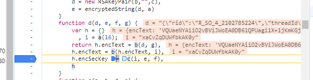 由上图可知,params由b方法得来,encSecKey由c方法得来,可以直接在这里下断点,也可以直接向上找,就在上面就有。
