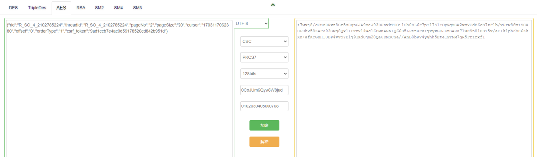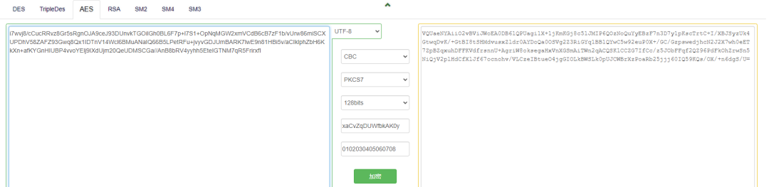 先把明文加密,这里的vi在上面的b方法中有,因为断点处已经调用了两次b方法,根据流程,我们用生成的随机数:xaCvZqDUWfbkAK0y(上图有)再把密文进行加密。