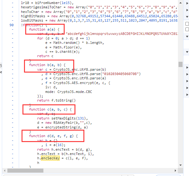 function b(a, b) {var c = CryptoJS.enc.Utf8.parse(b), d = CryptoJS.enc.Utf8.parse("0102030405060708"), e = CryptoJS.enc.Utf8.parse(a), f = CryptoJS.AES.encrypt(e, c, {iv: d,mode: CryptoJS.mode.CBC});return f.toString()}function c(a, b, c) {var d, e;return setMaxDigits(131),d = new RSAKeyPair(b,"",c),e = encryptedString(d, a)}